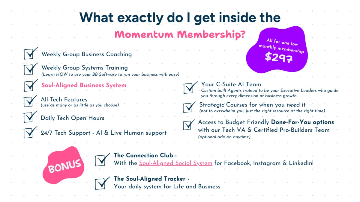 You’ll get full access to our Business Blender Software platform (CRM, email/SMS, websites, automations, memberships, and more), our signature Soul-Aligned Business System with custom AI Agents, live weekly group coaching, live Daily (weekdays) Tech Open Office Hours, 24/7 human & AI tech support, an interactive support community.